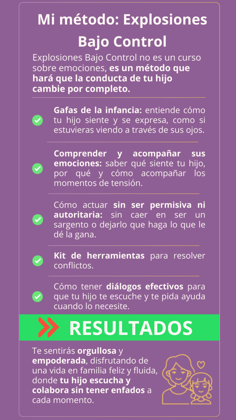 Explosiones Bajo Control es una estrategia que transforma la relación con tus hijos. Menos rabietas, más colaboración en las rutinas diarias, niños que piden ayuda de buenas maneras y una vida familiar más tranquila y satisfactoria.